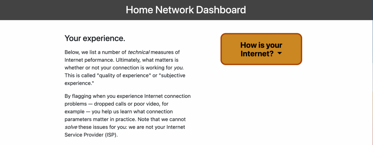 We encourage you to visit your dashboard on a regular basis to explore each indicator and how it changes or remains stable over time. At the very top of your dashboard, we also include a button that you can click on to report the quality of your Internet as you are experiencing it in real-time. Sending a quick update on your Internet experience can help us study which of these indicators, alone or in combination, determines whether your Internet is performing well or poorly.